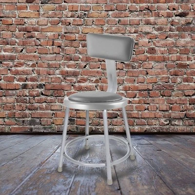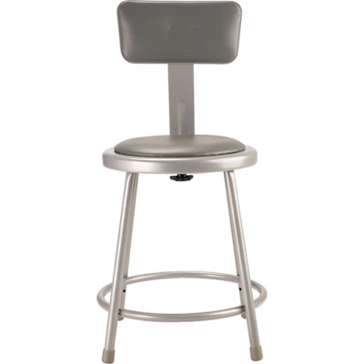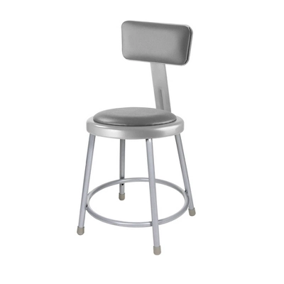 The fortified construction and soft comfort of the 6400 Series heavy-duty padded stools with backrests are ideal for hands-on educational settings like art rooms, science labs, home economics or shop classrooms. This reliable stool features a sturdy frame of 18-gauge steel tubing securely welded to a 14 diameter seat pan. Riveted through the steel pan are 1/2″ -thick gray vinyl cushioning that will provide years of dependable use. Footrest ring is securely bonded to each leg with four spotwell contact points. The padded adjustable backrests can be moved two inches up/down and forward/back