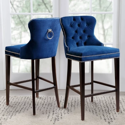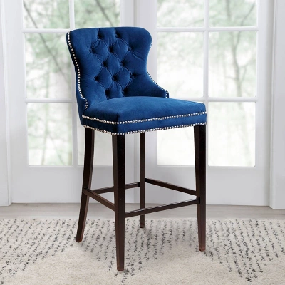 Create a bold style in your kitchen or home bar with the Monet Tufted Barstool from Abbyson Living. This modern bar height stool features a sturdy solid hardwood frame that sits atop birch wood legs awash in a rich espresso finish that creates a warm look and a strong foundation. The seat and back are lined with generous foam cushioning to make for a very comfortable seat, all wrapped in a luxuriously soft and richly colored velvet upholstery that give this contemporary bar stool a supremely enjoyable look and feel. Silver nailhead trim detailing along the edges and button-tufted seat back, as well as a silver ring handle in the center of the chair back are finishing touches that give this contemporary upholstered bar stool its unique and fashionable appeal.