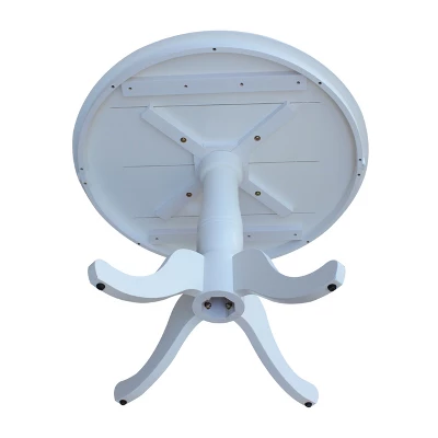 For those who appreciate high quality wood furniture with a traditional and elegant look. International Concepts home furnishings will complement any décor. This Table is made of solid wood ensuring years of use. The table features a butcher block top and a pedestal base with four feet for maximum support. It has a beautiful white finish. The round table top measures 36″ W x 36″ D, and is available in standard dining height, counter height, and bar height options. The standard dining height table is for use with dining chairs and is 28.9″ H. The counter height table is used with counter height stools and is 34.9″ H. The bar height table is 40.9″ H and is used with bar stools. This Solid Wood table ships ready to assemble.