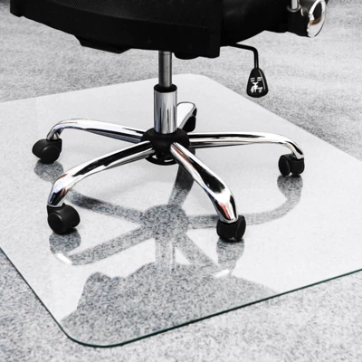 - A thick reinforced glass floor protector is perfect under any small, medium or large computer desk space; Provides superior protection compared to plastic PVC or polycarbonate