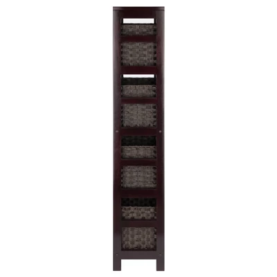 Combine extra storage space with the convenience of the versatile Winsome Wood Leo 5-Piece Storage Shelf set. Great narrow shelf that includes 4 foldable baskets for added organization. Simple yet sophisticated design is a perfect addition to use as a standalone bookcase in the family or living room. Keep seasonal accessories handy in the closet or use as a standalone bookcase in the family or living room. Finished in a rich espresso and made of solid wood for long-lasting durability. The set of baskets are woven in durable flat polypropylene in a chocolate finish and have two cut out handles, one on each end, for carrying purposes. Prompt up and these baskets measure 10.24”W x 11.02”D bringing charm and style. When not in use, they fold for easy storage taking up almost no space. So, whether you need it in the mud room for shoes, laundry room for the towels and detergents, or for your books in your home office, this 4-tier shelf offers stylish organization for all your essentials. This set is shipped in three boxes. The shelf will ship separately and will include the hardware necessary for assembly.