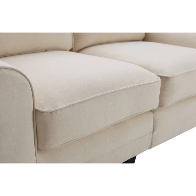 - Rolled arms, plush cushions and soft fabric create a cozy, contemporary style that completes any home decor
