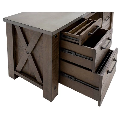 Jasper makes a rugged addition to any home or office. The rough-hewn wood finish highlights intentionally split wood veneers to provide authentic, aged character. While faux concrete tops add to the mix of materials imparting rustic industrial appeal. This item has three utility drawers and one locking file drawer for ample storage.