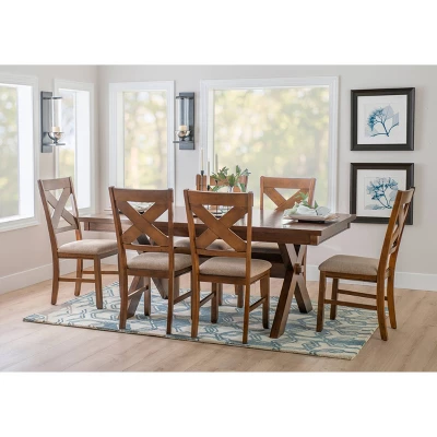 The Jackson Acacia Dining set is a great family piece. Featuring an expansive tabletop which offers seating for many, the table also has a self storing 18″ butterfly leaf, making it 90″. Finished in a Dark Hazelnut, the table features thick, sturdy legs in an X-design.The Jackson Dining Side Chair is a great addition to the Jackson Dining Table. Featuring an X-styled back and plush 100% polyester upholstered tan seats, the frame is finished in a Dark Hazelnut. Some assembly required.