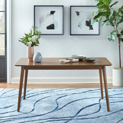 - Walnut finished rectangular table with rounded edges features tapered angled legs