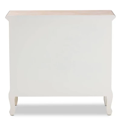 Enhance your bedroom with the charming Amalie dresser. Constructed from wood, this dresser pairs a white-washed oak tabletop with polished white drawers. The tabletop features space to place a lamp and some decorative items, while four drawers offer storage space for clothing and knick-knacks. Each drawer is adorned with molding detailing and an elegant brass metal handle. Inspired by French provincial furniture, the Amalie displays exquisite carvings on the bottom, as well as cabriole legs. The Amalie dresser is made in China and will arrive fully assembled. Dimensions: 29.53″ High x 31.5″ Wide x 13.78″ Deep; Upper Drawers: 11.81″ High x 11.02″ Wide x 4.92″ Deep; Middle Drawer: 25.39″ High x 11.22″ Wide x 4.92″ Deep; Lower Drawer: 25.39″ High x 11.22″ Wide x 4.92″ Deep;