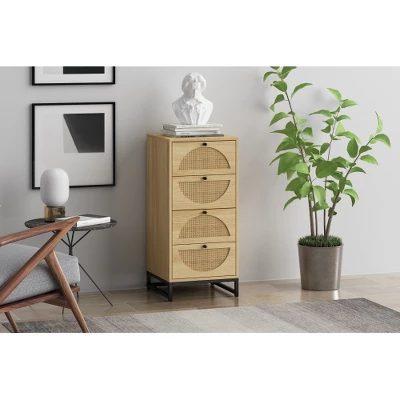 The four-drawer storage cabinet can focus on your hallway, living room or bedroom. Four same size storage drawers provide enough storage for your daily necessities, enclosed storage allows your items to avoid dust stacking. There is a handle on each drawer, easy to pull out and close. The body of this modern farmhouse cabinet is made of environmentally friendly rattan and MDF, the safe and environmentally friendly materials ensure the stability and durability of this cabinet. Support by metal legs, don’t worry, it will be easily dumped.