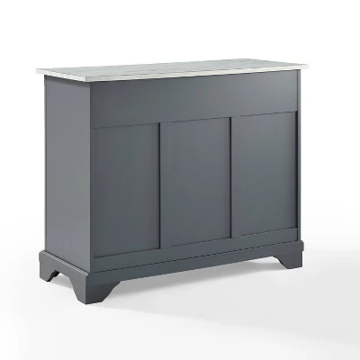 Increase the functionality of your kitchen with the Avery Kitchen Island. This traditional style packs a storage punch with two large drawers and three cabinets, perfect for tucking away servingware and seasonal items. The solid top features a paper marble finish for a rich yet cost-effective aesthetic. Crafted from solid hardwood and birch veneers, it’s a sturdy addition. Brushed nickel hardware completes the monochrome look. Both casters and classic feet are provided for your choice of a stationary island or rolling cart.