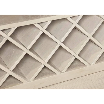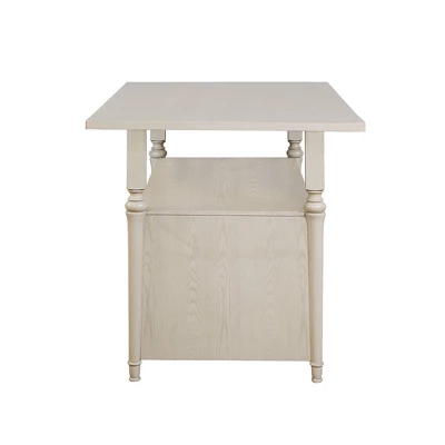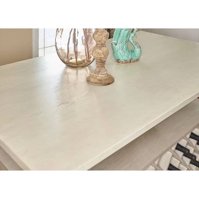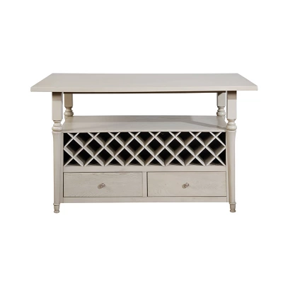 Allowing you to entertain with effortless elegance, the Hayes Counter Table complements any home. Featuring a gorgeous frost finish, the table offers a large tabletop and decorative turned legs. There is ample storage space with open shelving, a center divider to allow use of removeable 22 bottle wine storage or open space, and two large pass through drawers – all accessible from either side of the table.