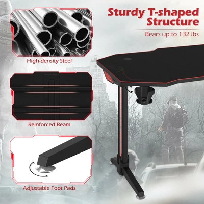 - Sturdy Metal Construction: Crafted from durable steel frame and MDF board, the gaming desk is steady enough to support up to 132 pounds. And the metal legs are designed with stable T-shaped structure, which will also leave enough room for your leg. In addition, adjustable foot pads add extra stability for the gaming desk.