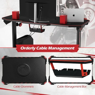 - Awesome Gaming Features: A cup holder and a headphone hook are attached to the desk to free up desktop space. And you can enjoy a drink while gaming without worrying about spilling. Besides, with two cable grommets and a socket box, you can organize the wires of different devices and have a tidy and comfortable game environment.