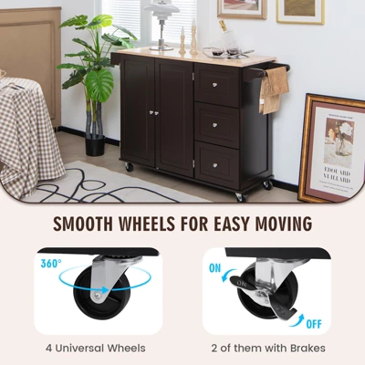 This kitchen trolley cart features ample spaces for storing wines, foods, seasonings, kitchen appliances, tableware, towels, etc. The 2 shelves in the cabinet are also adjustable to match items of various sizes. For families having limited space, this kitchen cart can be used as a dining table when you expand the drop-leaf tabletop. This sturdy rubber wood tabletop additionally ensures strong stability and durability. Furthermore, if you need to move it, the 4 smooth wheels help. And 2 of them are lockable that can steadily stop the rolling island cart.