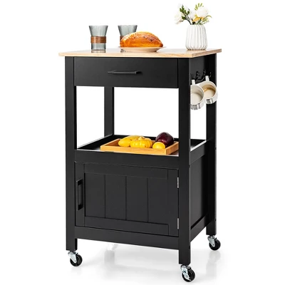 Our small kitchen island cart is a perfect storage solution for narrow spaces. It has 1 sliding out drawer under the top, 1 open shelf in the middle and 1 door cabinet on the bottom, allowing you to better organize different stuff. Besides, 3 handy hooks on right side can be used to hang rags or kitchen utensils. The rubber wood countertop is durable and easy to clean. What’s more, 2 unlockable wheels and 2 lockable wheels help you to easily move it and fix it in position. And the casters with metal brakes is not easy to crack. To offer more convenience, we also design it with convenient handles, magnetic catch and premium hinge. In addition, the kitchen serving cart is easy to assemble with clear instruction and complete accessories.