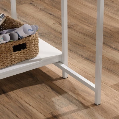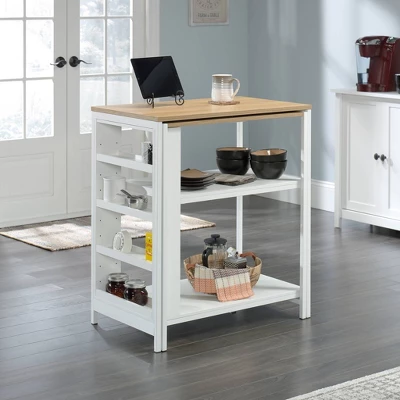 Need extra counter space in your kitchen? Are your cupboards looking a little full? No need for a complete remodel when there is this kitchen island from the Sauder Select collection. This metal kitchen island is counter-height and can have multiple functions in your kitchen: From acting as an island or multipurpose stand to storing kitchen appliances when they are not in use. A convenient hidden top extends on metal framing to provide additional prep surfacing when needed. Both the top and slide-out surface of this moveable kitchen island feature melamine top-coating which is heat, stain and scratch-resistant. This counter height table is the perfect place to sharpen your cooking skills! This kitchen island with storage features three adjustable shelves to accommodate a variety of kitchen items like spices, bottles, wine glasses and more. Constructed with a durable, white metal frame and a White finish with Baltic Oak™ accents, this multipurpose kitchen island adds needed storage space and style to your home.
