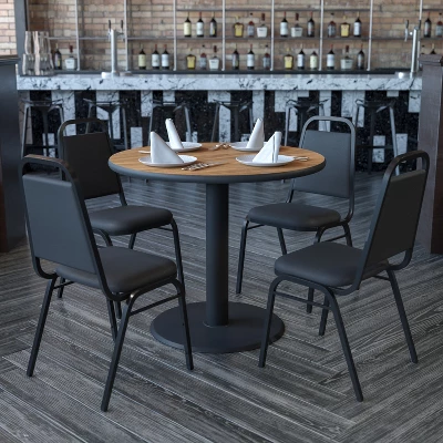 Don’t have time to search through hundreds or thousands of table and seating options? This complete Bar Height Table and Stool set saves you time to focus on your growing business. This set includes an elegant Walnut Laminate Table Top, X-Base and 4 Metal Ladder Back Barstools. Surface is heat, scratch and moisture resistant. Easily clean using a mild detergent and water, then wipe dry to keep your tables spotless. Use this setup in sports bars, banquet halls, restaurants, break room/cafeteria settings or in your breakfast nook or home bar. Mix in bar height tables with standard height tables for a more varied seating selection. Plastic floor glides prevent damage to your flooring. Whether you are just starting your business or upgrading your home or business furniture this restaurant quality bar table set will round out your dining space. Additional Features: Trapezoid Back Metal Barstool: 500 lb. Seating Capacity, Stacks 15 Chairs High, Seamless Back Panel, Upholstered Seat and Back, 1.5″ Thick Padded Seat with CAL 117 Fire Retardant Foam, 16 Gauge Steel Frame, Double Support Braces, Plastic Bumper Guards Prevent Scratches on Frame, Powder Coated Frame Finish, Non-Marring Plastic Floor Glides, Limited Lifetime Warranty on Frame, Chair Size: 17.5″W x 20.25″D x 34″H, Back Size: 14.5″W x 15.5″H, Seat Size: 15.5″W x 15.75″D x 18″H
