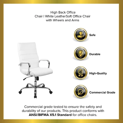 An elegant blend of comfort and style, this high-back LeatherSoft office chair is the perfect seating solution for your workspace. Crafted from black LeatherSoft material with gold arms and base, the ergonomic design brings a sleek look with ample durability and support for long-term use. Designed for exceptional comfort, this LeatherSoft office chair features a cushioned seat and back upholstered in white LeatherSoft for softness and durability. Padding on the arms lends additional comfort, while horizontal stitching along the seat and back adds a touch of refinement. The high-back office chair features extended height to support your upper back and help relieve back tension. A waterfall front seat edge removes pressure on your lower legs, to help improve circulation during long hours at your desk. Complete your custom fit with the pneumatic seat height adjustment lever and a tilt-lock mechanism for a rocking and reclining motion. Easily maneuver through a variety of tasks with the full 360-degree swivel chair motion that is ideal for shifting between your computer, phone, and more. When you need to reach things a little further away, simply roll your chair with the smooth movement of the wheeled base. A bright gold finish adorns the frame and arms of this office desk chair, creating a sleek and timeless look. The classic black LeatherSoft pairs effortlessly with any office decor style, creating a comfortable and elegant impression that’s perfect for residential or corporate workspaces.
