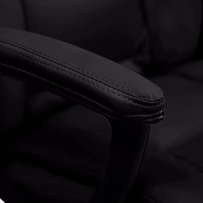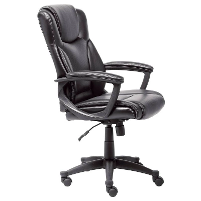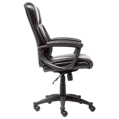Modern in both look and functional design, the Connor desk chair by Serta is a statement in efficiency. With a cushioned, contemporary profile, this chair is designed with comfort in mind with adjustable height and recline tensions. Its waterfall seat edge is curved to lessen back pressure and increase circulation. The design makes it suitable for many types of office decor, from modern to traditional. Its leather upholstered cushions are accented by a black frame to improve any office’s decor aesthetic. The padded arms provide support and comfort, highlighting its ergonomic design. The sturdy 5-point base features castor wheels that roll with ease.