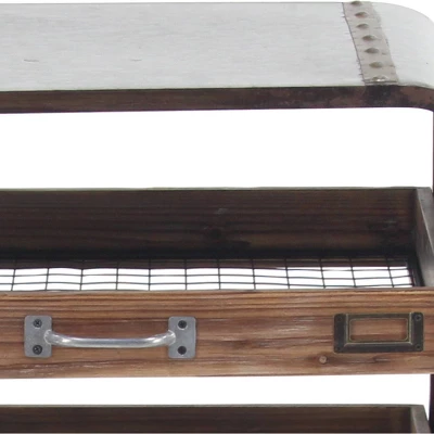 - This industrial metal and wood tray chest features gray rectangular frame with brown slide-out drawers