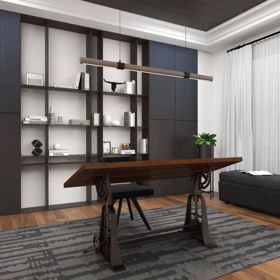 - •It highlights a natural wood brown tabletop finish and charcoal black metal legs and stand