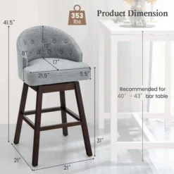 Costway Set Of 2 Swivel Bar Stools Tufted Bar Height Pub Chairs With Rubber Wood Legs Grey/Beige