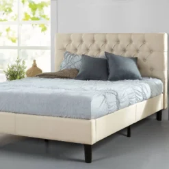 All the classic styling you desire and the sturdy support that your mattress needs come together in this Misty Upholstered Platform bed frame in beige. Featuring a button tufted headboard designed to skillfully hold the frame. All shipped in one wonder-filled box delivered directly to your home.