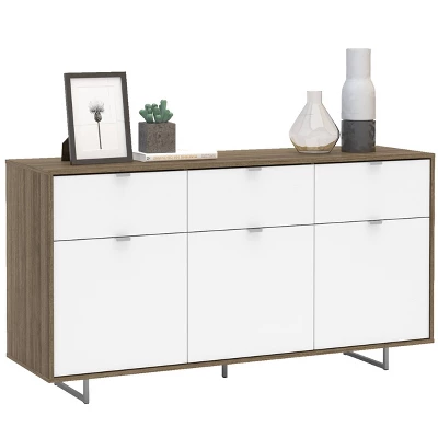 The Montana Sideboard is the perfect fit for any home with it’s modern and functional design. This sideboard has a white and walnut melamine finish with metal legs. The 3 drawers and 3 cabinets offer plenty of storage options to keep all your items organized. This sideboard is available in two sizes – 58 inch width and 53 inch width.