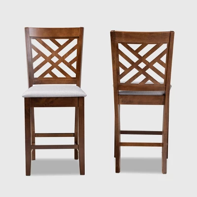 Redefine your dining space with the elegance and comfort of the Caron pub chair. This rubberwood chair features a warm walnut brown finish that complements the light polyester fabric upholstery. Padded with foam for the highest level of dining comfort, the Caron features a stunning cut-out back for enhanced visual appeal. This stylish chair is suitable for use with pub tables and kitchen counters. The Caron pub chair is made in Malaysia and requires assembly. Dimensions: 42.52″ high x 18.31″ wide x 20.28″ deep; Seating dimensions: 18.31″ wide x 16.34″ deep x 25″ high (from floor); Back: 17.52″ high; Legs: 23.23″ high;