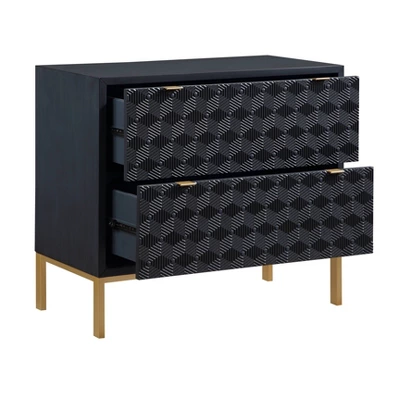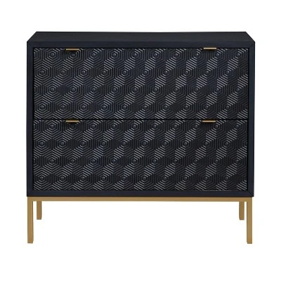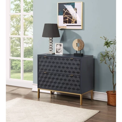 Finished in our Prism Royal Blue, this two drawer chest is a sight to behold. The raised tumbling rock design across the two drawers creates a rippling effect as light and shadows dance across it. This beautiful chest provides not only that extra storage you need, but also gives you an ideal display area for your favorite photos, lamps, or a vase of fresh cut flowers.