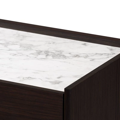 The sleek, modern flair of the Walker chest organizes your space in stunning style. Made in Malaysia, the Walker radiates rich wood tones with its dark brown finished frame. Five spacious drawers, outlined in a striking gold-tone finish, help maintain busy rooms with ample storage space for clothes, linens, and more. Requiring assembly, the Walker features a faux marble top for a luxurious accent steeped in modern glamour. With its radiant design and flexible convenience, the Walker chest is a superb addition to any space. Dimensions: 39.4″ High x 31.5″ Wide x 15.75″ Deep; Drawer Dimensions: 2.9″ High x 28.1″ Wide x 12.25″ Deep;